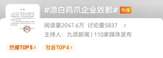 3月16日,#漂白鸡爪企业致歉#冲上热搜。据悉,四川省蜀福香食品有限责任公司发声明:我司生产销售的鸡爪产品因涉嫌违规使用过氧化氢(双氧水),被央视“3·15”晚会曝光。对此,我们深感愧疚与自责,向社会各界致以诚挚的歉意目前,我司正全力配合政府部门调查处置,并自愿承担由此引发的责任。今后,我司将严格遵守相关法律法规,全面落实食品安全管理制度,切实履行企业主体责任,并主动接受社会监督!