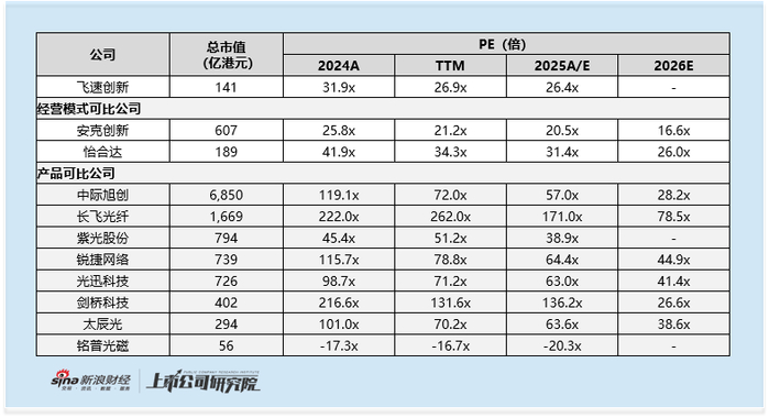 按基础发行规模、发行价下限测算,公司对应市值141亿港元,以2025年前三季度净利润20.6%的同比增速推算全年归母净利润4.76亿元为基准,对应2025年预测市盈率约26.4倍。这一估值水平相较于A股同赛道硬件企业普遍50倍以上的市盈率存在显著折价,也正因如此,市场普遍认为飞速创新的估值具备较强吸引力。