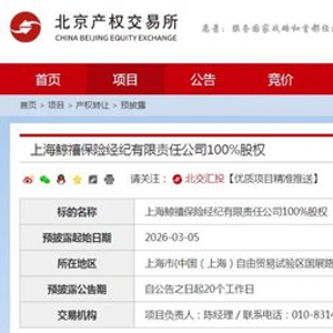 3月18日,《国际金融报》记者注意到,上海鲸禧保险经纪有限责任公司(下称“鲸禧保险经纪”)100%股权转让信息正在北京产权交易所进行预披露,预披露结束日期为4月2日。