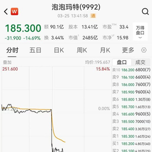 3月25日午后,港股泡泡玛特盘中大跌近16%,截至发稿跌幅收窄至14%,报185.3港元/股,最新市值2485亿港元,较前一日蒸发超200亿港元。