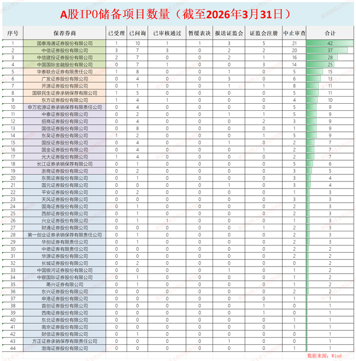 截至2026年3月31日,国泰海通、中信证券、中信建投、中金公司A股IPO储备数量(以交易所受理为标准,不包括已发行及已终止项目)排名前四,属于第一梯队(≥20个属于第一梯队),数量分别为42个、37个、28个、25个。