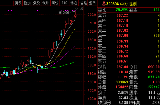 值得注意的是,中际旭创仍表现坚挺,股价再度攀升,盘中最高至919.99元/股,续创历史新高,市值一度突破万亿元大关,近一年以来该股累计涨幅已超1000%。