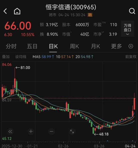 Wind数据显示,4月24日,恒宇信通股价收报66元/股,涨幅为10.55%,市值为40亿元。值得注意的是,恒宇信通股价于1月12日触及阶段高点后持续回落,4月23日、24日连续两个交易日,在航空航天板块拉升带动下,股价大幅上涨。今年以来,该股累计跌幅为6.57%。