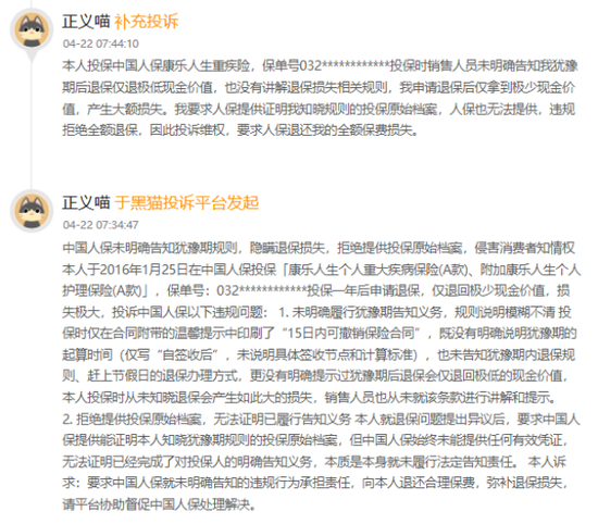 二是销售环节法定告知义务缺位,误导销售引发退保纠纷。4月22日有消费者连续投诉,人保健康长期重疾险销售中,未明确告知犹豫期规则,也未提示超犹豫期退保仅退还极低现金价值的核心条款,消费者投保一年后退保产生大额损失,要求公司提供已履行告知义务的投保原始档案,公司始终无法提供,却拒绝全额退保。