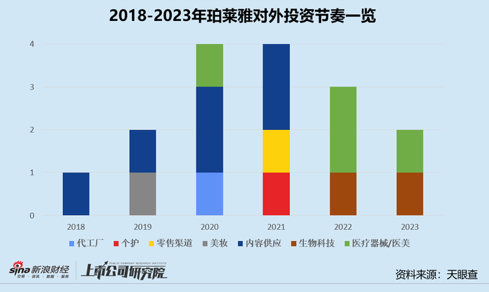 2、布局集中在个护、美妆、内容营销、医疗器械/医美、生物科技、代工厂和零售渠道7大细分领域。医疗美容器械和相关生物科技研发是当下的主流风潮,其本质还是尽快丰富单品矩阵,加固护城河。