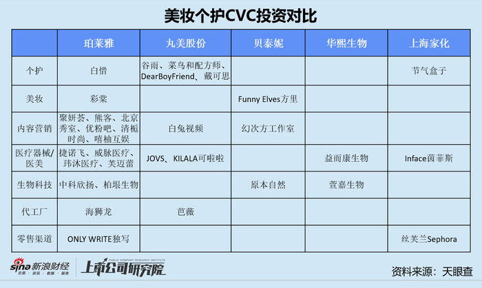 比对珀莱雅、丸美股份、贝泰妮及投资活跃度较低的华熙生物、上海家化的投资案例不难发现,美妆个护的CVC投资有以下共同特点: