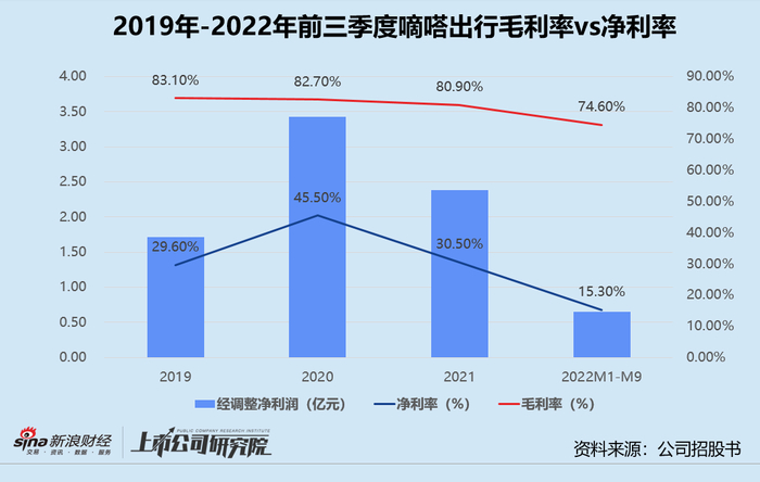 作为轻资产运营的出行平台,嘀嗒出行早于2019年便摆脱了巨额亏损泥沼。2019-2021年期间,公司毛利率保持在80%以上,经调整净利润一度达3.43亿元。