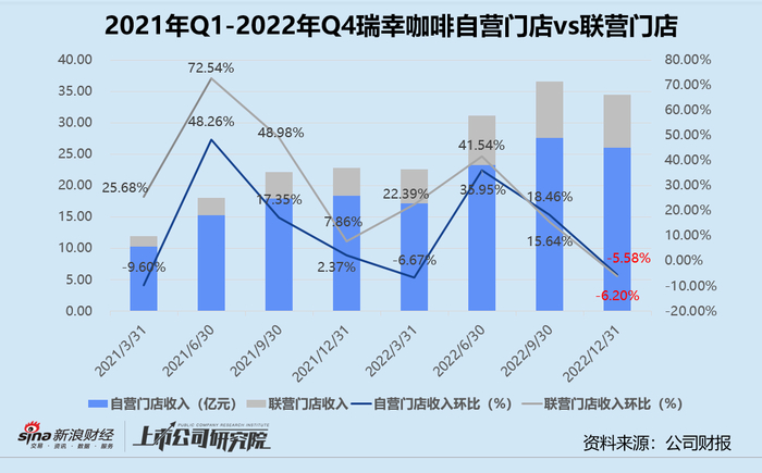 据招股书显示,截至2022年12月31日,瑞幸共有5651家自营门店,2562家联营门店。第四季度报告期内,自营门店收入约为26.07亿元,同比增长41.92%。联营门店收入8.43亿元,与2021年同期相比增长87.92%。