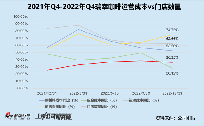 另一项值得关注的成本是销售和营销费用。2022年瑞幸的销售费用约为5.70亿元,同比增长69.14%。第四季度销售费用约为1.73亿元,同比增长74.75%,约为同期门店同比增速的2倍。