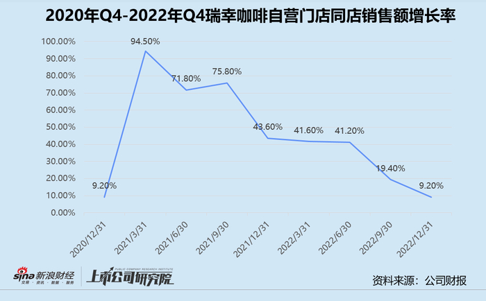 从自营门店层面来看,同店销售额增长速度大打折扣。2022年全年自营门店的同店销售额增速约为20.60%,不足2021年的三分之一。
