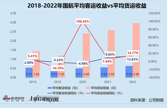 运输周转量、运力经营效率表现堪忧,国航的平均客运收益和平均货运收益却在三大航司中排名第一。2022年平均客运收益增长13.83%至0.63元,港澳台航线每收费客公里收益较2021年激增47.05%;2022年每收入货运吨公里收益逼近3元,港澳台航线平均货运收益由2021年的7.79元提升至9.12元。