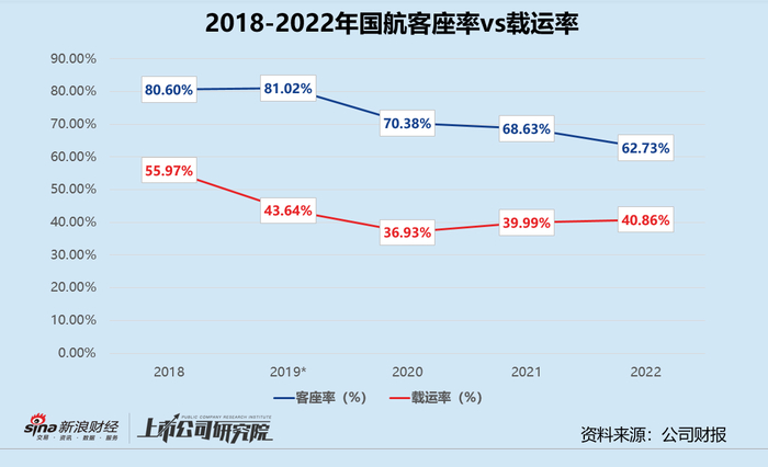 运营效率指标层面,2022年国航的客座率仅为62.73%,与2021年同期相比减少近6个百分点,在三大航司中表现垫底。国内旅客周转量和港澳台航线旅客周转量分别下滑43.29%、39.78%,而同期国内和港澳台航线客运运力投入分别缩减38.37%、30.95%,运力过剩情况普遍存在;货邮载运率同比微增0.87个百分点达40.86%,已是近3年以来的最高点,但仍较2019年下降2.77%。