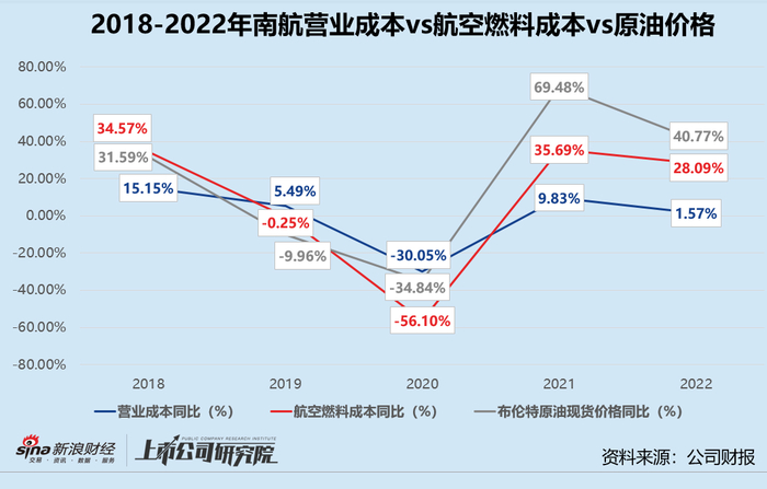 值得一提的是,南航大部分的航油消耗以中国现货市场价格在国内购买,除了调控国内航线旅客燃油附加费收取标准,并无其他有效的途径管理航油价格变动风险。结合往期数据来看,南航的航油成本变动与原油现货价格变动基本同步,营业成本增速放缓全靠公司在其他业务成本上节流。