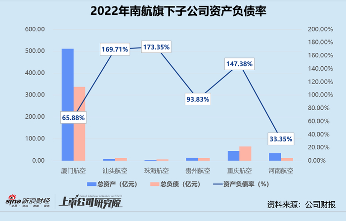 集团自顾不暇,旗下的子公司也陷入资不抵债的局面。南航持股比例均为60%的汕头航空、珠海航空和重庆航空,2022年资产负债率分别为169.7%、173.3%、147.4%。贵州航空报告期内的资产负债率达93.83%,也远高于70%警戒线。