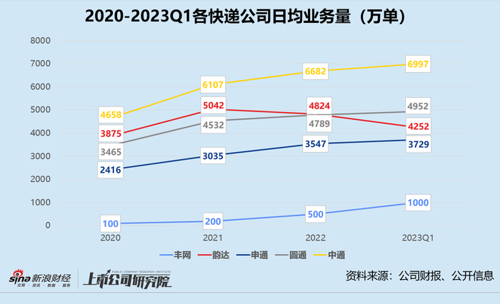 尽管站点增长势头迅猛,丰网的日均业务量却一直进展缓慢。2020年双十一期间,丰网首次突破日均100万单,2021年达到日均100-200万单,2022年则保持在日均300-500万单区间。直至2023年初,丰网才刚刚实现800-1000万单,与同期“三通一达”(中通、申通、圆通和韵达)数千万单的业务量不可同日而语。