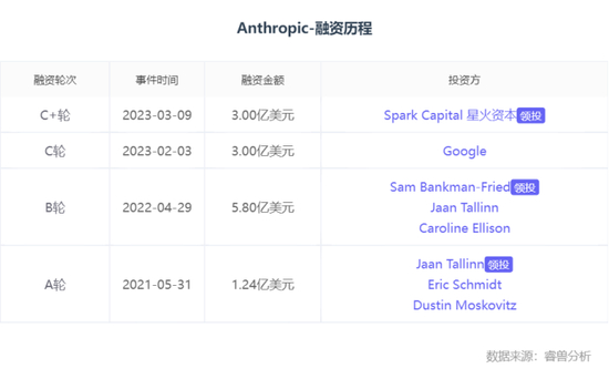 Anthropic在2月和3月连续获得谷歌和Spark Capital分别领投的2轮金额为3亿美元的投资,晋升数十亿美金独角兽。
