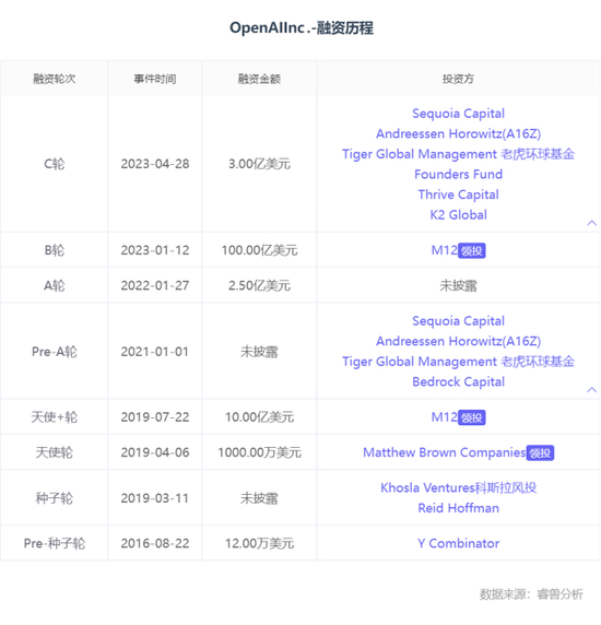 今年4月,Open AI完成103亿美元融资,估值达到290亿美元。参与本轮融资的风投公司包括老虎全球管理、红杉资本、a16z、Thrive Capital、K2 Global和Founders Fund。据悉,本轮投资金额为3亿美元,与早先微软入股属于同一轮。今年稍早,微软对Open AI的投资规模据称大约100亿美元。