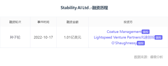 去年10月,Stability.ai宣布获得1.01亿美元投资,由Coatue Management、Lightspeed Venture Partners和O‘Shaughnessy Ventures LLC投资,当时投后估值约10亿美元。