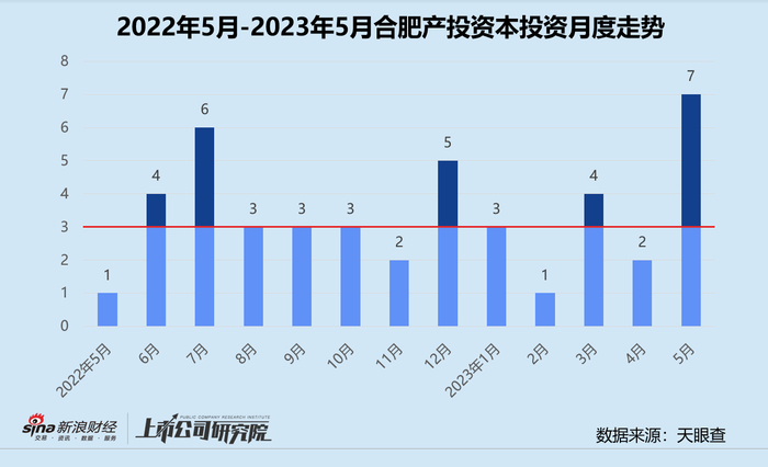 统计区间内,合肥产投公开披露的股权投资事件共7起,约为2022年同期的7倍,环比增长250%。往期数据显示,2022年下半合肥产投的投资频率整体放缓,直至本月才展露出强势复苏的迹象。