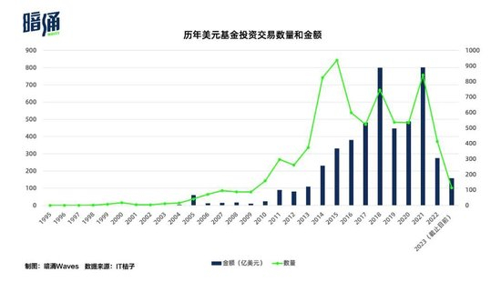 另一组数据更为直观。根据IT桔子实时统计,国内市场中的美元基金2005年的投资交易金额仅为60亿美金,这一数字在2018年和2021年达到顶峰——都近乎800亿美金,又在此后急转直下:2023年至今仅为157亿美金。