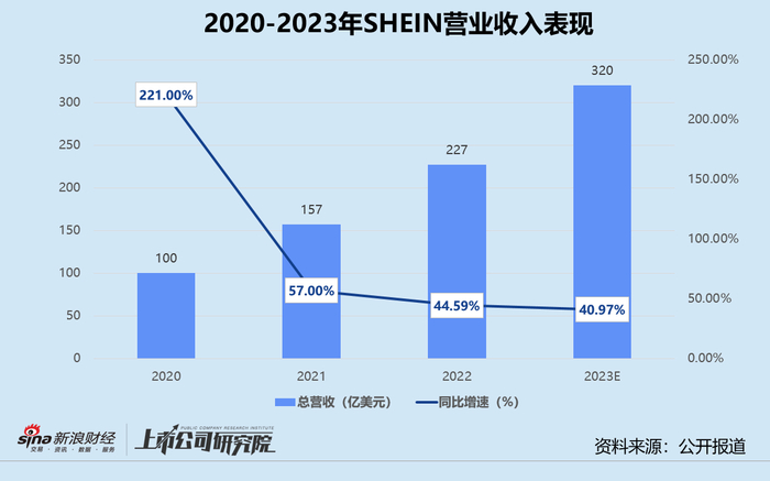 据公开报道显示,成立于2008年的SHEIN,2013年获得第一笔500万美元融资,直至2018年才正式驶入快车道。这一年平台总营收达到20亿美元,红杉中国和顺为资本以25亿美元估值为基础向其注资。2019-2022年,SHEIN的GMV、收入和净利润一路水涨船高。2023年前三个季度,公司营收达到240亿美元,同比增速超40%。若保持增长势头,预计2023年收入总规模有望实现320-330亿美元,净利润或高达25亿美元。