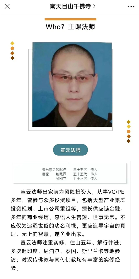 宣云法师出家前为风险投资人,从事 VC/PE 多年,在多年的商业从业经历后,他感悟人生苦短、世事无常。不应仅为追逐世俗的功名利禄,更应追寻宇宙的真理、无上的智慧,遂舍业出家。