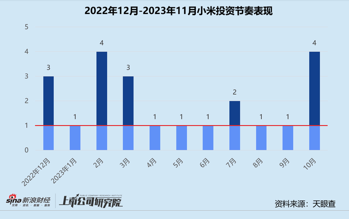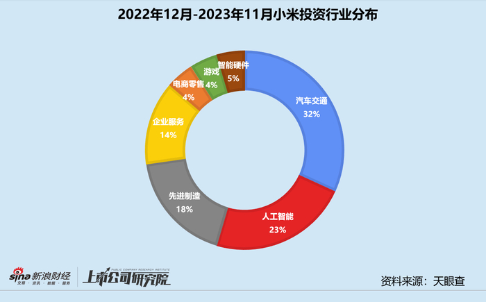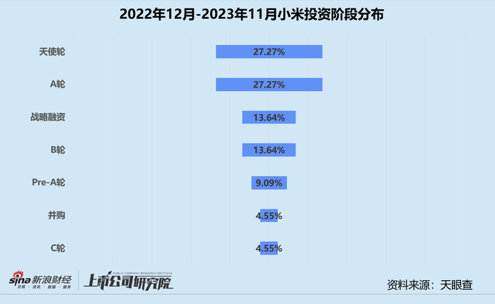 统计区间内,小米集团(下文简称:小米)公开披露的股权投资事件共22起,同比下降46.34%,自第二季度开始投资节奏放缓。从投资阶段来看,处于早期的天使轮、Pre-A轮和A轮占比合计63.64%,较2022年同期提高近20个百分点,“投早”策略进一步升级。战略融资占总投资事件数约14%,与2022年同期基本持平,但远低于2021年的22%。从所关注的行业赛道来看,小米偏好汽车交通和人工智能行业。最为聚焦的汽车交通领域,超71%投资于汽车制造和汽车零部件项目,其余近30%投向自动驾驶技术企业,全方位为即将亮相的小米汽车“铺路”。