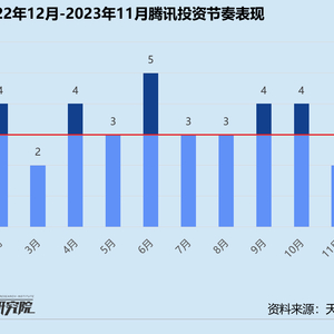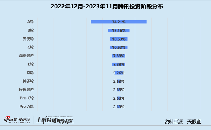 统计区间内,腾讯投资(下文简称:腾讯)公开披露的股权投资事件共38起,不足2022年同期的30%,平均每月投资节奏稳定在10起左右。从投资阶段来看,种子轮、天使轮、Pre-A轮和A轮投资事件占据半壁江山,金额较大、阶段靠后的战略融资仅占总投资事件数7.89%,远低于2022年的14%、2021年的42%。从所关注的行业赛道来看,腾讯偏好人工智能和游戏赛道,其中基础大模型和AIGC获投项目占比约为13.16%,游戏开发获投项目占比约15.79%。