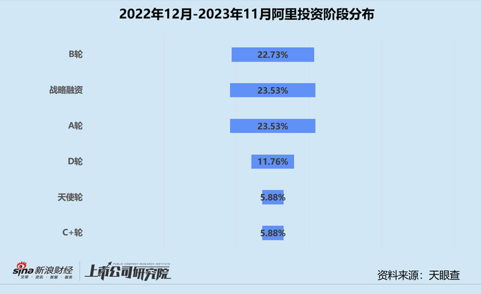 统计区间内,阿里战投(下文简称:阿里)公开披露的股权投资事件共17起,同比下降41.38%,自第二季度开始投资节奏基本稳定在每个月1-2起。从投资阶段来看,偏后的B轮和战略融资合计占总投资事件数46.26%,早期的A轮占比较2022年同期小幅下降近5个百分点。