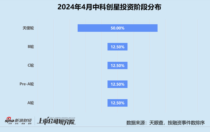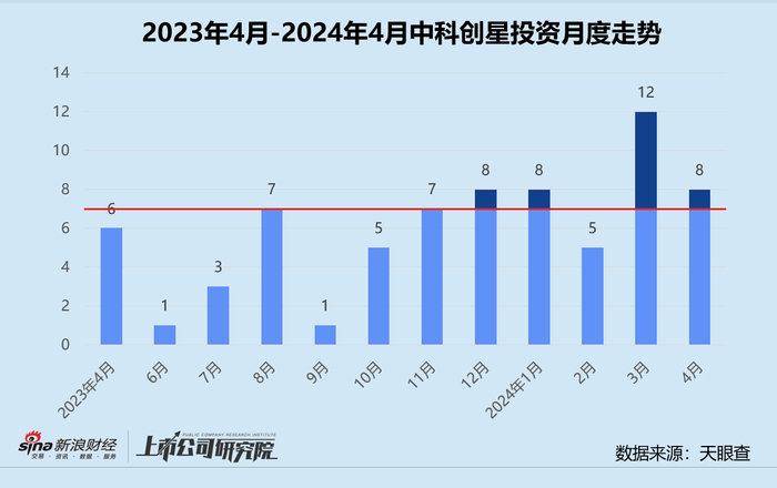 统计区间内,中科创星公开披露的股权投资事件共8起,较2023年4月增长33.33%,与3月相比下降33.33%。往期数据显示,2023年下半年中科创星投资节奏相对保守,月均出手次数保持在5起左右,直至第四季度才有所恢复,平均每月投资事件数逐月递增。2024年中科创星活跃度显著改善,一季度完成的投资事件数已为2023年全年同指标约72.92%。