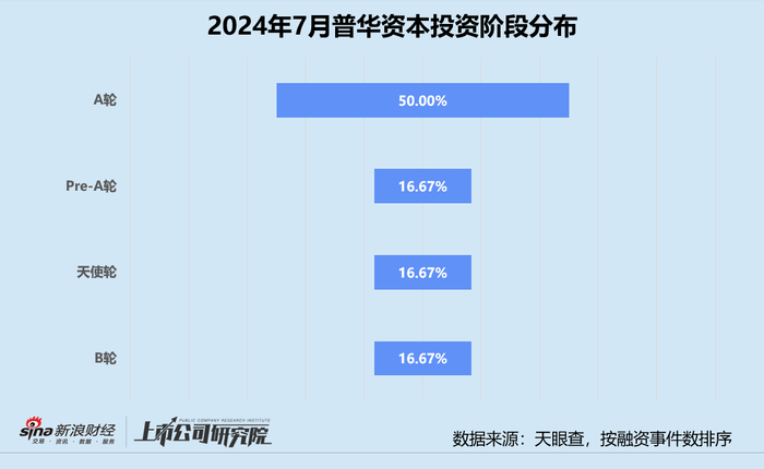 统计区间内,普华资本公开披露的股权投资事件共6起,同比提升50%,环比激增500%。结合往期数据分析,2023年下半年普华资本的投资节奏整体保持稳健,平均每个季度约投资10-15个项目。进入2024年后,其投资频率明显放缓,直至7月才显露出恢复的迹象。