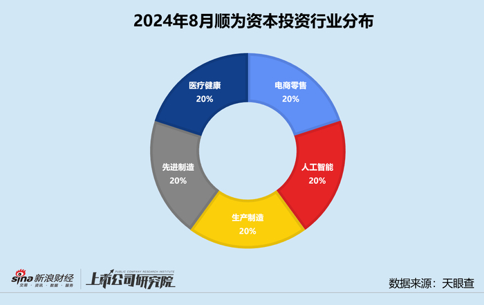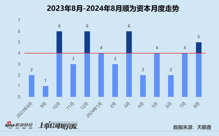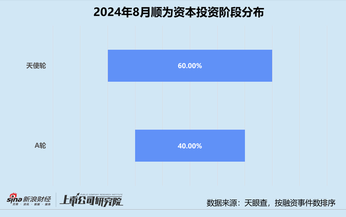 统计区间内,顺为资本公开披露的股权投资事件共5起,同比、环比分别提升150%、100%。结合往期数据分析,2023年下半年顺为资本整体保持稳健的投资节奏,第四季度一度投出了15个项目。进入2024年后,其投资频率有所放缓,8月投资事件数年内第二次达到中位线以上。