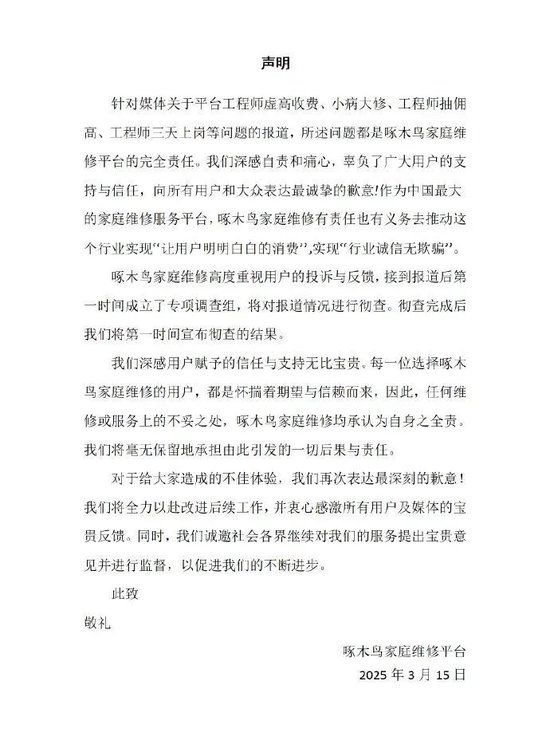 针对3·15晚会曝光平台乱象,啄木鸟维修随后发表声明称,针对媒体关于平台工程师虚高收费、小病大修、工程师抽佣高、工程师三天上岗等问题的报道,所述问题都是啄木鸟家庭维修平台的完全责任。啄木鸟家庭维修高度重视用户的投诉与反馈,接到报道后第一时间成立了专项调查组,将对报道情况进行彻查。彻查完成后将第一时间宣布彻查的结果。将毫无保留地承担由此引发的一切后果与责任。