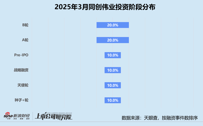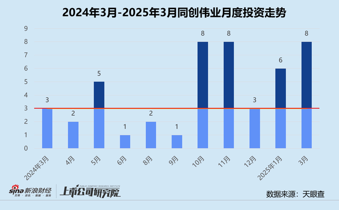 统计区间内,同创伟业公开披露的股权投资事件共8起,同比激增166.7%,较2025年1月提升33.3%。往期数据显示,自2024年下半年开始,同创伟业的投资节奏显著收缩,直至四季度才有所恢复。2025年第一季度,机构出手14次,环比减少26.3%。