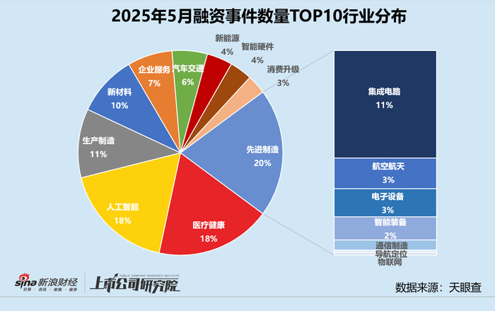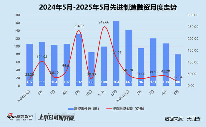 从融资行业分布来看,先进制造依旧凭借80起融资事件领跑,获投企业中约52.5%为集成电路公司,而2025年4月和2024年5月同指标分别为42.1%、50.0%。集成电路领域披露融资额占先进制造披露融资总额比例高达72.0%,同比提升超22个百分点。
