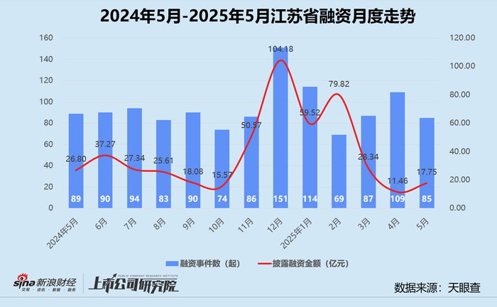 结合往期数据分析,江苏的融资事件数同比、环比分别减少4.5%、22.0%;融资额较2024年5月虽然下降33.8%,但与4月相比大幅增长54.9%,导致单笔融资额环比近乎翻番至2088.20万元,基本恢复至2024年9月同等水平。细究其获投项目所处赛道,江苏的先进制造、医疗健康公司在一级市场备受青睐,合计33家公司拿走了市场超十分之一的资金。