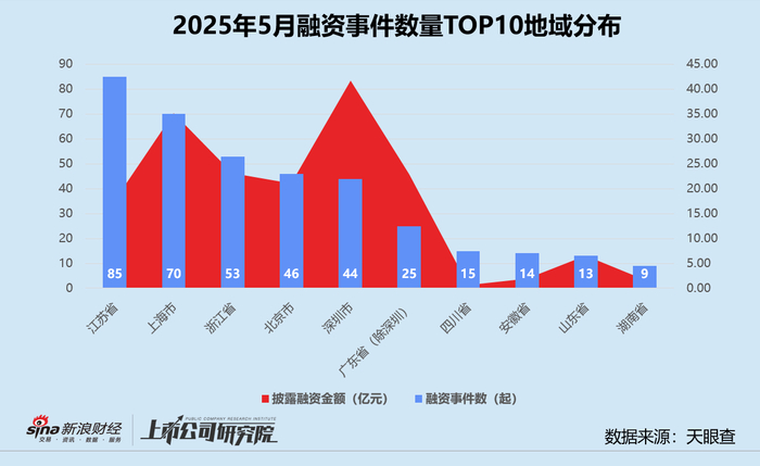 从融资地域分布来看,江苏期内合计完成85起融资事件,依旧保持领先地位。注册在深圳的「Airwallex空中云汇」获投3亿美元,促进区域总融资额达41.68亿元,约为第二名上海的1.19倍。湖南发力医疗健康、先进制造、人工智能等赛道,融资事件数和金额同比飙升350%、1600%。