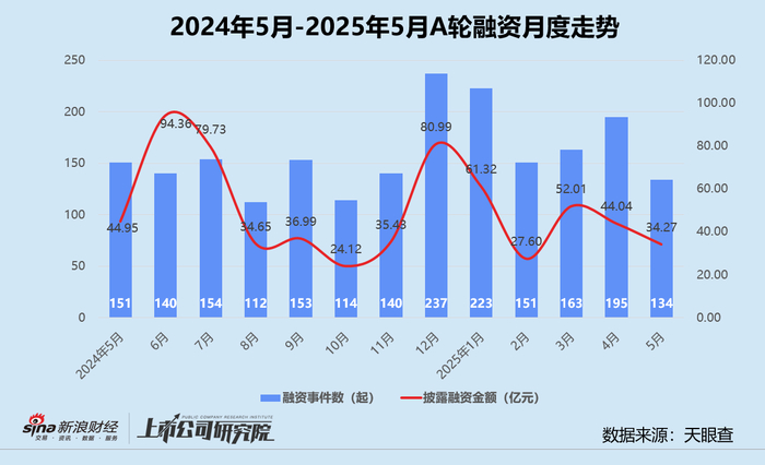 结合往期数据分析,本月融资频率最高的A轮,融资事件数、披露融资额较2024年5月分别下降11.3%、23.8%,平均单笔融资额由2977.09万元降至2557.66万元。与2025年4月相比,两项指标呈相同趋势,且降幅明显扩大,融资事件数减少31.3%,披露融资额降幅超22%。