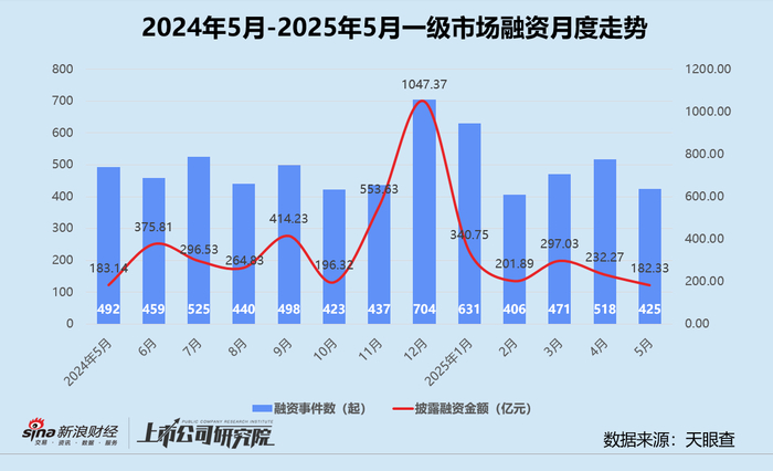 机构加速出清,基金募集活跃度尽管有所回升,但传导至投资端仍需时日。基于公开数据不完全统计,5月国内一级股权投资市场共发生428起融资事件,同比、环比分别减少13.6%、18.0%;披露总融资额约182.33亿元,与2024年5月基本持平,较2025年3月缩水21.5%;平均单笔融资额约4290.04万元,创下近五个月内最低点。