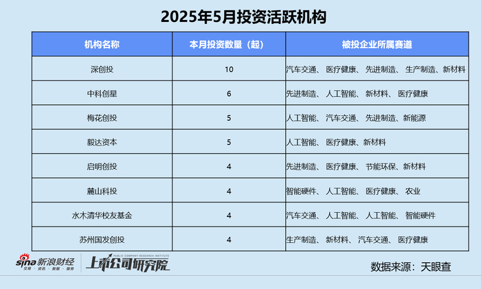 本月投资最活跃的机构包括深创投、中科创星、梅花创投等。投资事件总数在4起以上的机构中,国资背景机构约占62.5%。