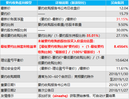 如果按照2018年11月27日收盘价进行的套利,根据要约收购套利模型的计算,最低要约收购比例为27.15%(因阎志与汉阳国资争夺控股权,故剔除汉阳国资35.01%的持股),未被要约收购的股份按买入价退出估算,套利收益率为8.4564%。