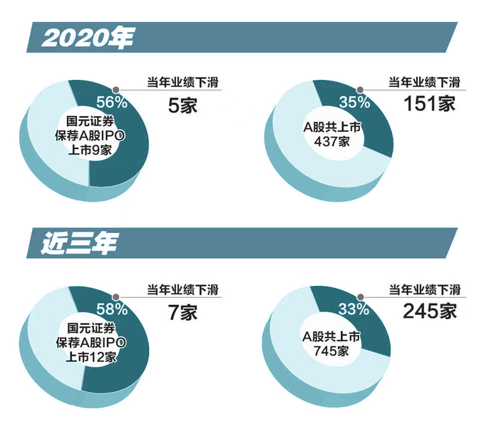 统计数据触目惊心:国元证券2018年至2020年保荐上市12单A股IPO项目,其中7单上市当年即出现业绩下滑,占比高达58%,较同期A股整体的IPO项目业绩下滑占比高出足足25个百分点。