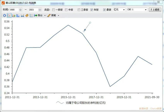 黄山胶囊历年净利润走势(箭头为上市当年)