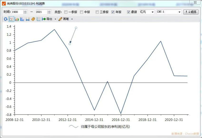 明星电缆(现名“尚纬股份”)历年净利润走势(箭头为上市当年)