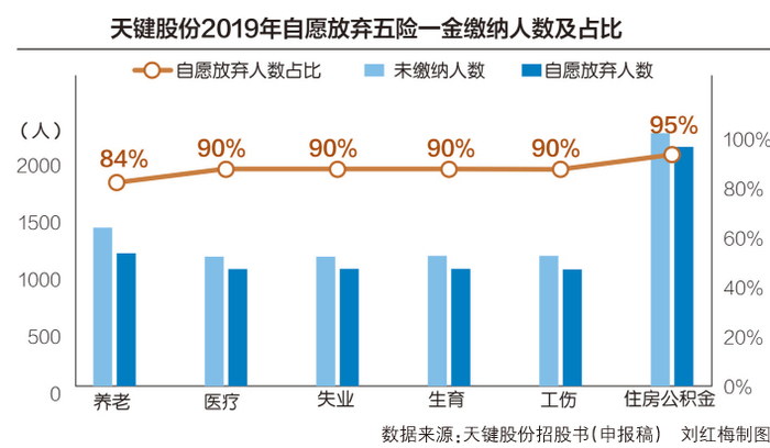 2019年,天键股份上述五险一金的未缴纳人数分别为1445人、1194人、1196人、1194人、1195人和2290人,占比分别为52.09%、43.04%、43.11%、43.04%、43.08%和82.55%。其中,自愿放弃的人数分别为1219人、1076人、1078人、1076人、1076人和2167人,占比分别高达84%、90%、90%、90%、90%和95%。