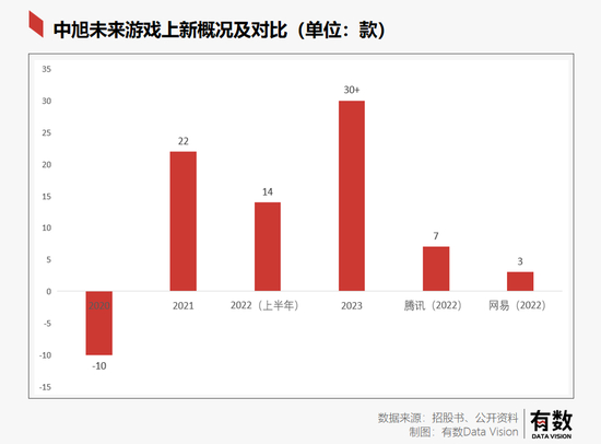 整个2022年,连国内Top1的腾讯都仅上线了7款新游戏,且均为前两年的存货,而新拿到的版号仅有2个。相比之下,中旭未来仅在2022上半年就新增了14款游戏,足足是腾讯的两倍,且有大量存货,显然已经超脱了行业常识。