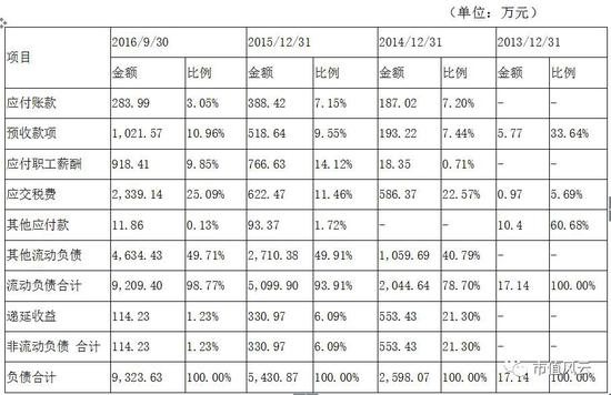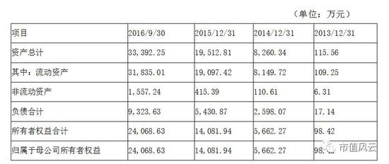 先看总资产,从2014年底的8260.34万元增长到2016年9月30日的33392.25万元,年复合增长率为122.15%,净资产从5662.27万增长到24068.63万元,年复合增长率128.62%。不管从总资产还是净资产来看,最近三年的增长都非常强劲。资产负债率分别为:31.45%、27.83%、27.92%,典型的低负债企业,这个后面再详细说下。