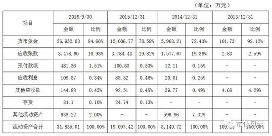 展开这流动资产一看,坛坛罐罐里都是软妹币,其货币资产占流动资产的绝大部分,其中2016年9月30日货币资金占流动资产比例将近85%,占总资产比例也超过80%。