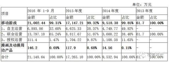 从总体数据来看,米哈游最近三年的增长非常强劲,2014年至2016年9月的复合增长率为57.67%(说明:2013年公司处于起步阶段,营收太少,不参与比较。)。公司业务分为移动游戏和漫画及动漫周边产品两大类,其中游戏收入占总营收的99%以上,漫画及动漫周边产品贡献收入不足1%,几乎可以忽略不计。