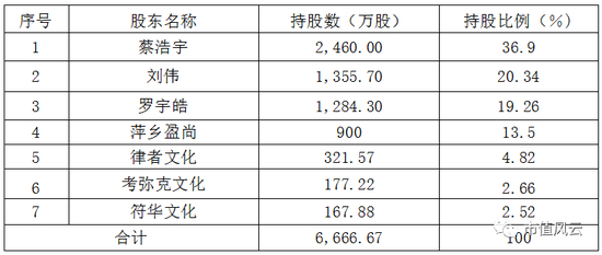 蔡浩宇,1987年,持有2781.57万股,持股比例为41.72%;